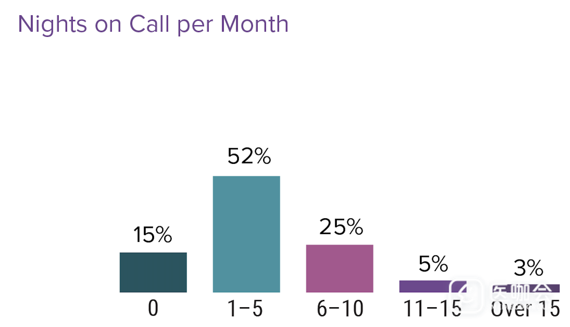 几乎一半的住院医每个月值夜班1-5次,25%为每个月6-10次。