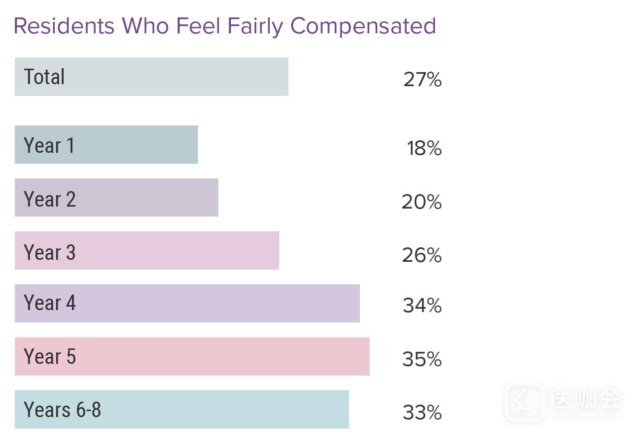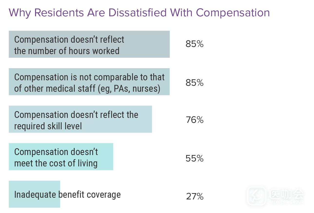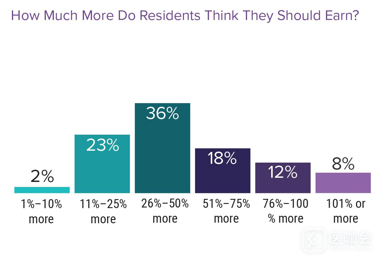 大多数住院医对自己的薪酬不满意,最主要的原因是他们认为收入与付出不匹配,以及自己的薪酬与其他医务人员(如医师助理、护士)的薪酬不一致。