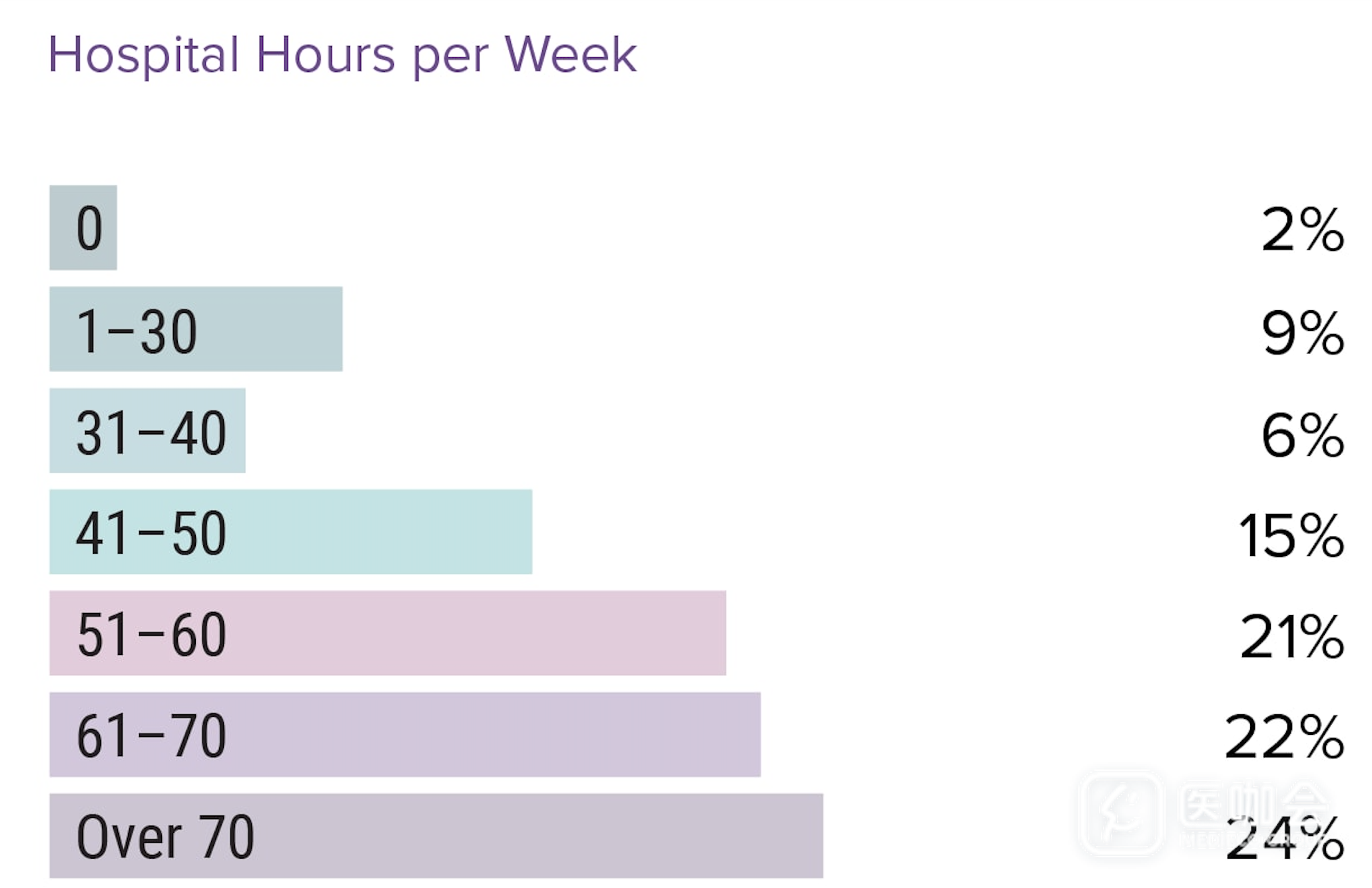 大多数受访者称,住院医的每周工作时间远超过40小时,2/3住院医的工作时间超过50小时,1/4超过70小时。