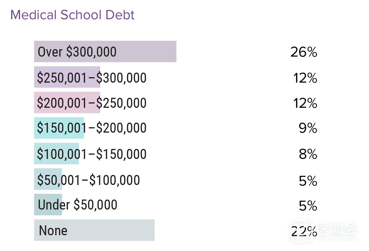 几乎一半的受访者表示有超过20万美元的医学生贷款,1/4的贷款超过30万美元,1/5表示没有贷款。