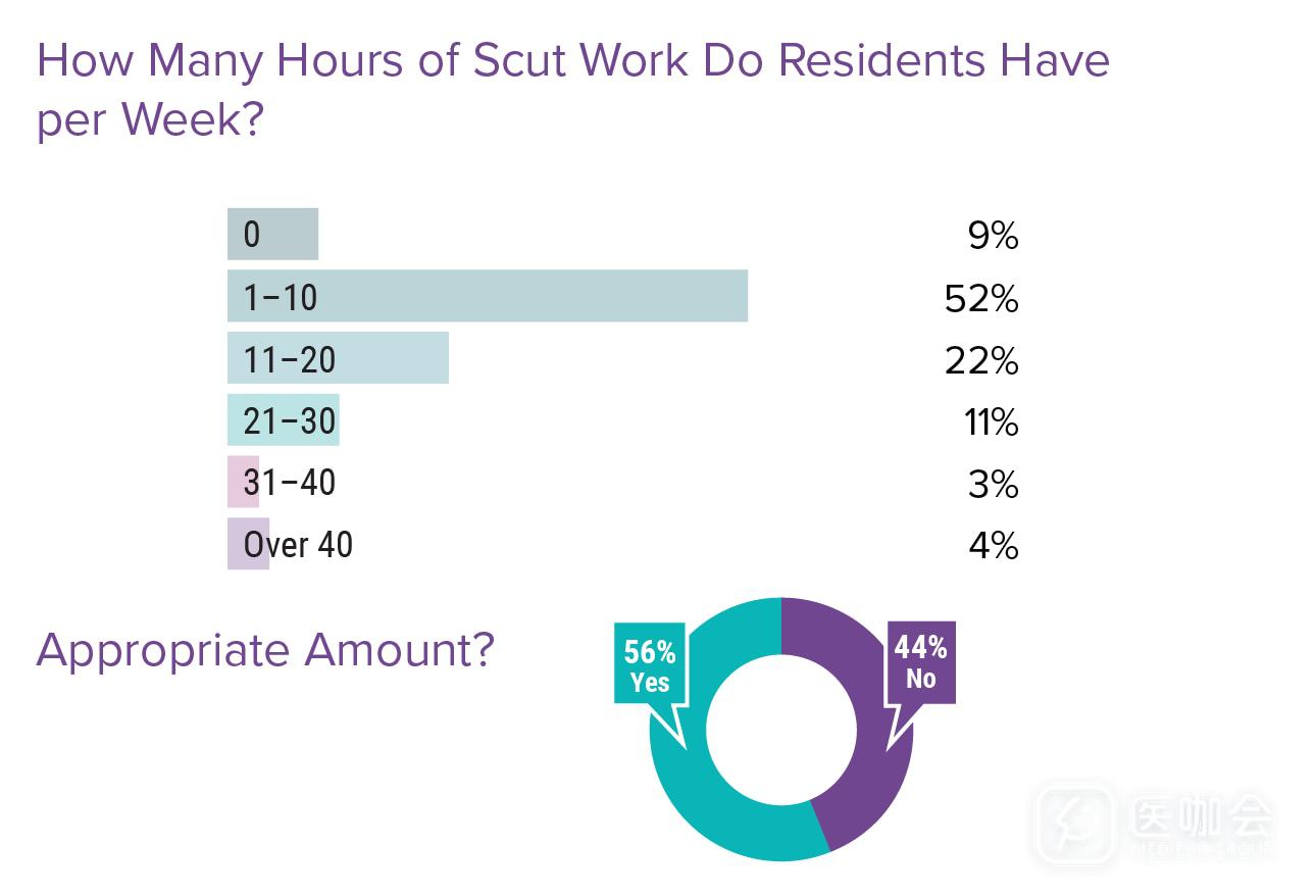 超过一半的住院医每周要花1-10小时在杂活上(没有技术含量的活),22%的人表示要花11-20小时,11%达到21-30小时。大部分住院医觉得这一时间还是比较合理的。