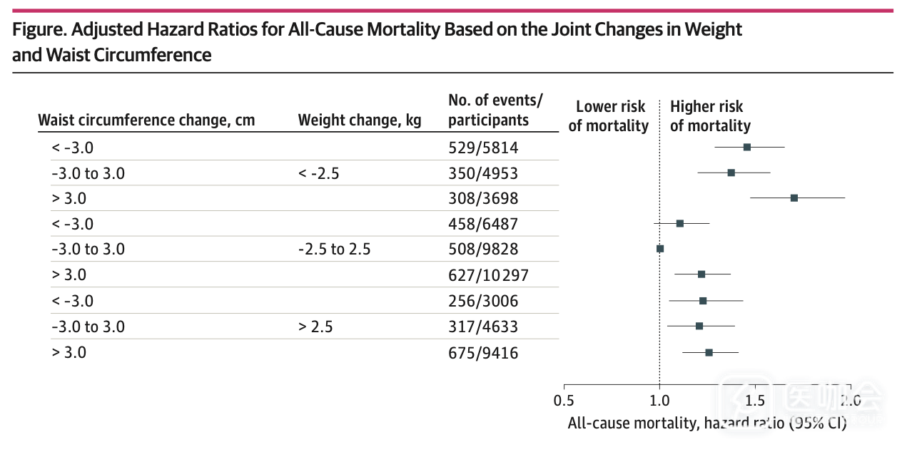 - 体重下降超过2.5kg,腰围增加超过3.0cm的参与者,死亡风险最高(HR=1.69;95%CI 1.46-1.96),明显高于其他组。