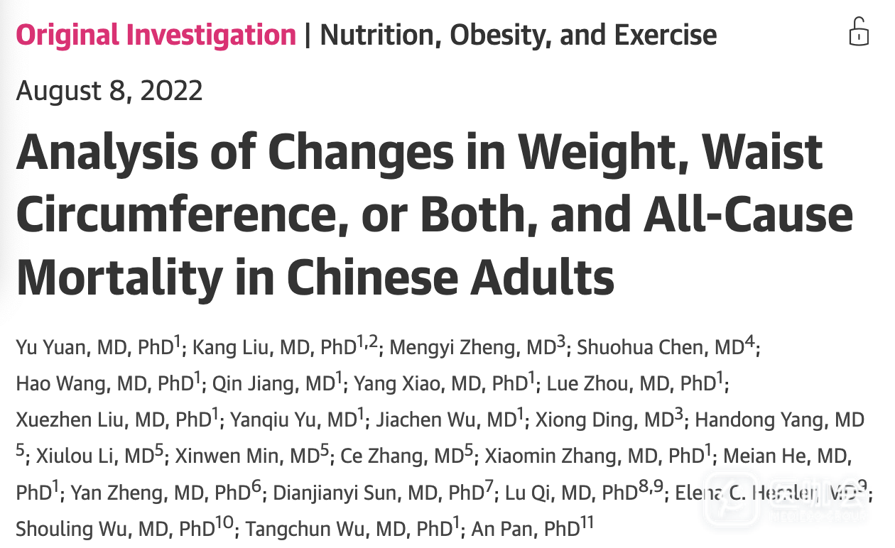 2022年8月8日,JAMA子刊《JAMA Network Open》(IF=13.353)刊登了一项中国研究,评估了在中年和老年人群中,体重、腰围的变化与全因死亡率的相关性。结果表明,在这类群体中,体重下降但腰围增加,有更高的死亡风险。