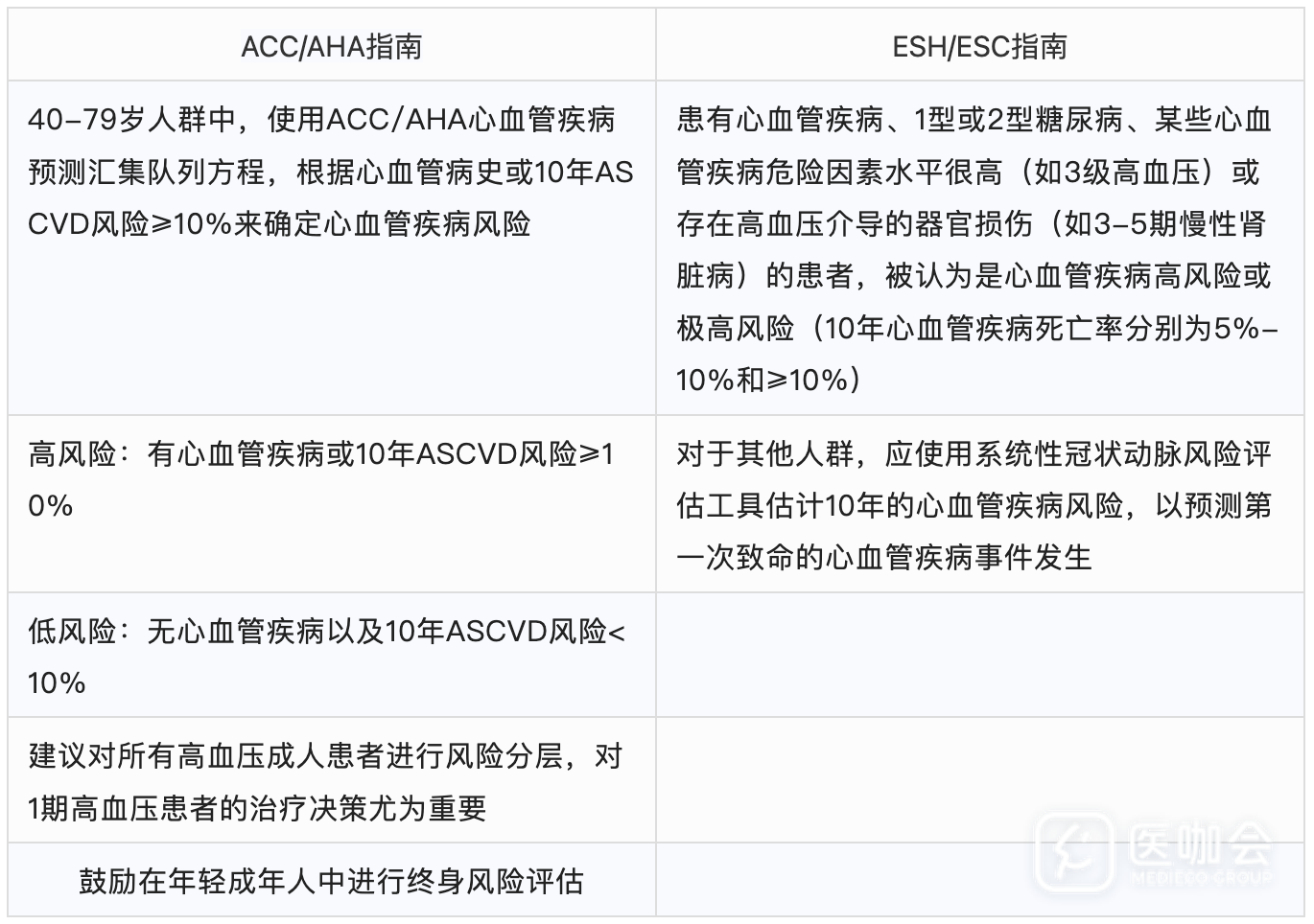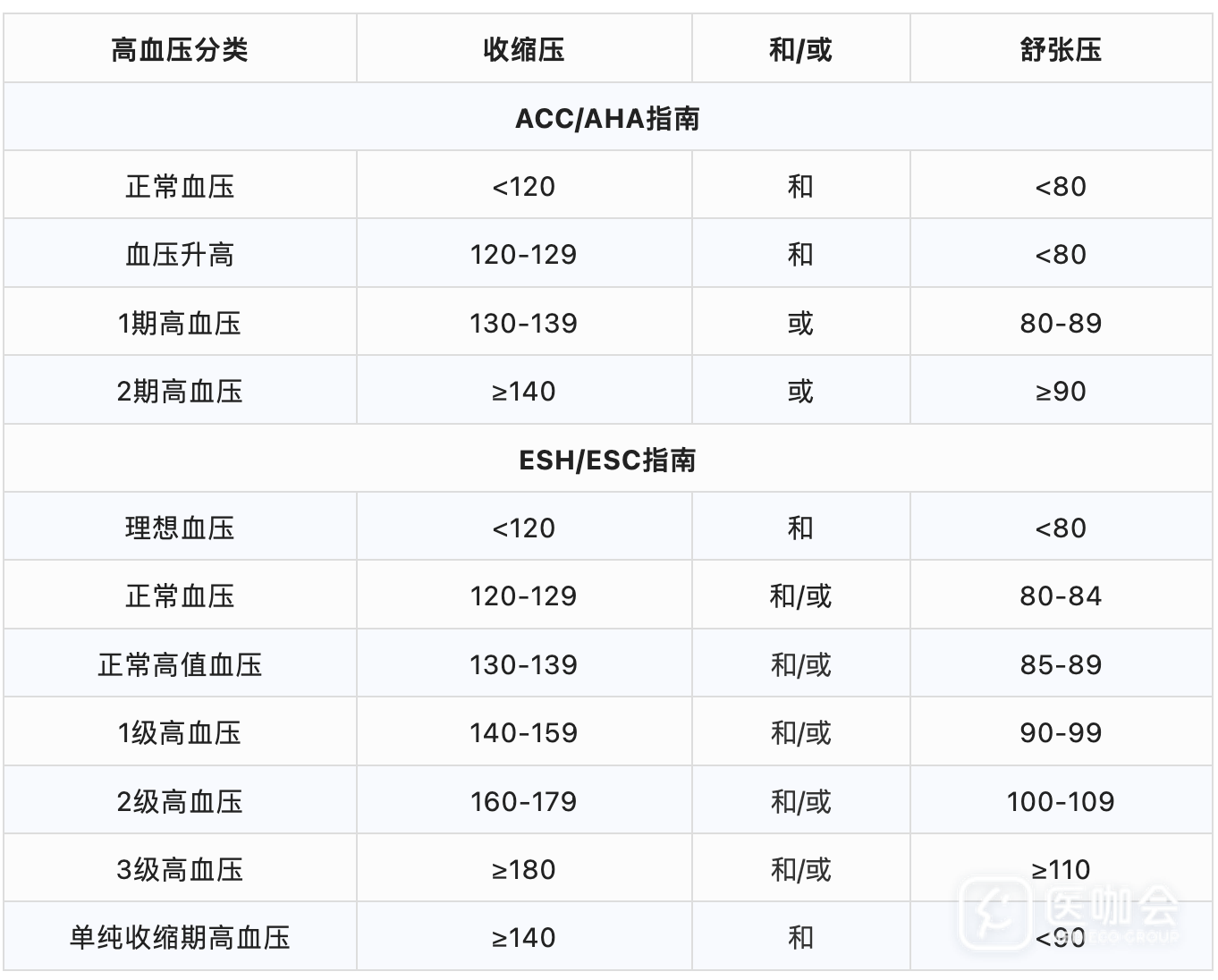 两个指南之间最明显的区别是血压分类方法和确诊高血压的血压阈值。ACC/AHA指南将血压分为:正常血压、血压升高、1期和2期高血压,收缩压≥130mmHg和/或舒张压≥80mmHg确诊为高血压。