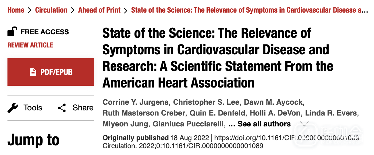 2022年8月18日,《Circulation》(IF=39.918)刊登了一项来自美国心脏协会(AHA)的科学声明[1],总结了如下心血管疾病的症状以及这些症状的临床意义,包括急性冠状动脉综合征(ACS)、心力衰竭(HF)、瓣膜病、卒中、心律失常和外周血管疾病。