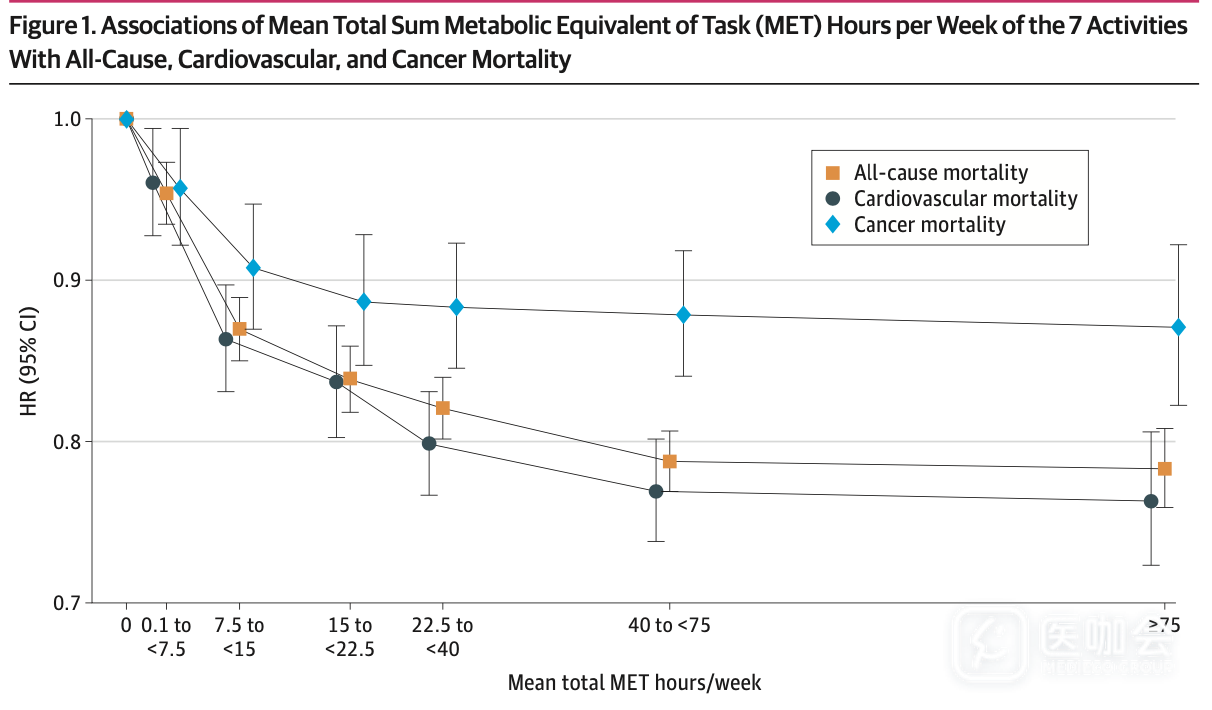 每种运动类型与死亡风险都显示出以下关联:与不运动相比,适度运动和积极运动的参与者(即每周0.1-15 MET小时)的参与者,死亡风险显著降低(包括心血管和癌症死亡风险)。