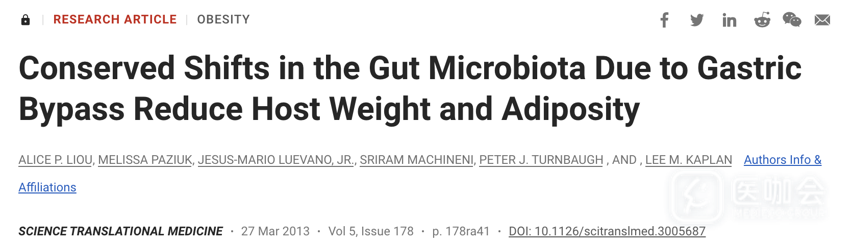 Lee Kaplan的研究发表在《Science Translational Medicine》上,在这项研究中,接受减肥手术小鼠的肠道微生物发生了显著变化,当把这些微生物移植到其他小鼠的肠道中时,移植受者的体重也快速下降。这项研究表明,在不做手术的情况下,通过粪便微生物群移植(FMT),可以获得20%的减重获益。