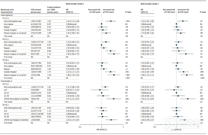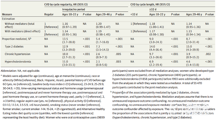 主要采用COX比例风险模型在不同年龄段(14-17岁;18-22岁;29-46岁)分别分析月经周期特征与CVD的风险关系。考虑到口服避孕药对月经周期特征的影响,该研究将每年口服避孕药2个月以上单独作为一个暴露组。该研究还进行了一项中介效应分析,来估计高胆固醇血症、慢性高血压和2型糖尿病在月经周期特征(18-22岁和29-46岁)和CVD风险关联中能够解释的变异程度。