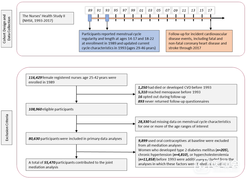 从1991年起,NHS II队列每两年调查一次参与者的社会人口学特征、行为特征、生育因素和健康结局。研究最终纳入80630位护士,具体的随访过程和排除标准如图1所示,CVD的结局事件随访至2017年。