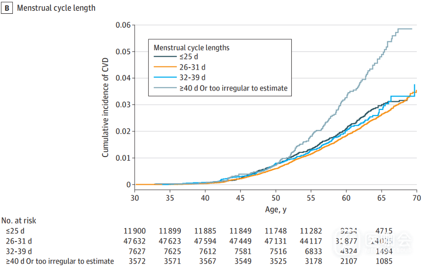 - 29-46岁女性护士月经周期40天及以上或月经周期无法评估组的CVD累计风险最高。