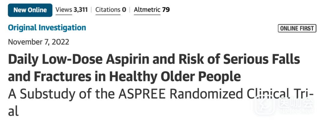 2022年11月7日,《JAMA Internal Medicine》(IF=44.409)刊登了一项随机对照试验的结果[1],探讨每日使用低剂量阿司匹林(100 mg/d)对健康老年人骨折或跌倒风险的影响。结果显示,低剂量阿司匹林未能降低健康老年人骨折风险,反而增加了严重跌倒的风险。
