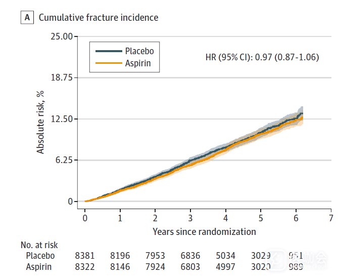 - 阿司匹林组 vs. 安慰剂组的首次骨折或复发性骨折发生率没有差异:HR = 0.97, 95%CI 0.87-1.06, P = 0.50;HR = 0.96, 95%CI 0.87-1.06, P = 0.40。