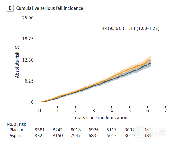 阿司匹组的参与者严重跌倒的次数更多。阿司匹林组:750人(9.0%)经历了884次严重跌倒;安慰剂组:687人(8.2%)经历了804次严重跌倒:发生率比值(IRR)= 1.17;95%CI 1.03-1.33;P = 0.01。