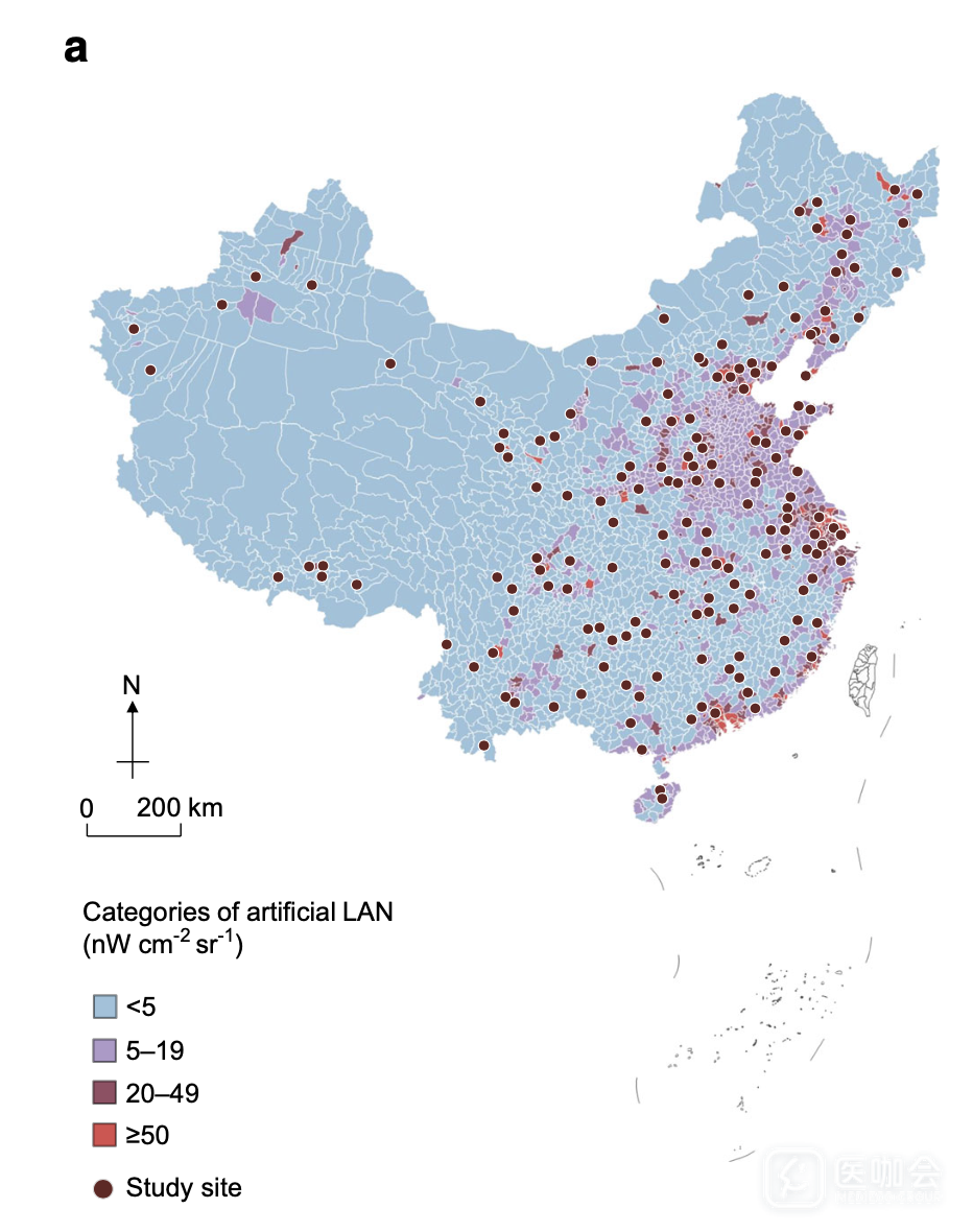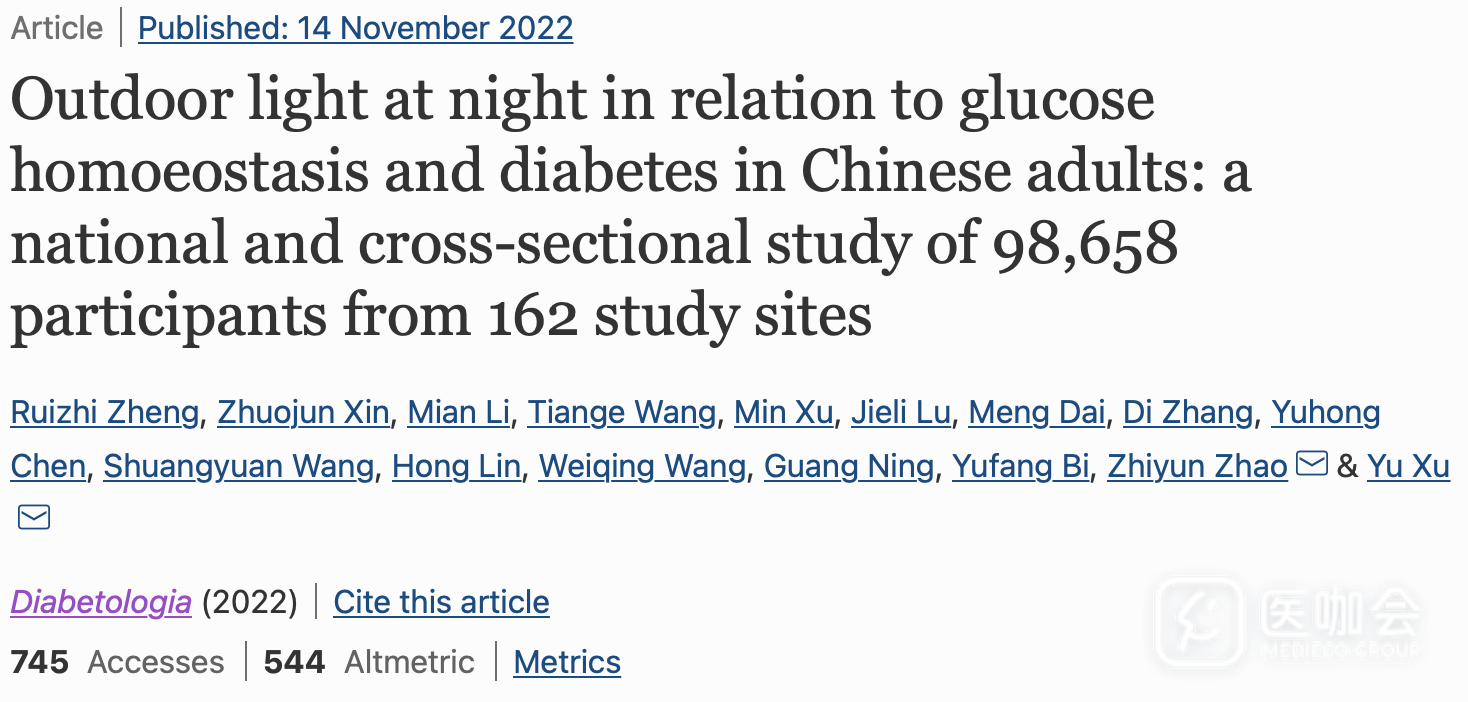 2022年11月14日,《Diabetologia》(IF=10.46)刊登了一项中国研究,这项全国性横断面研究评估了长期暴露于室外人造光与糖尿病患病率的相关性。结果表明,夜间长期暴露于高强度的室外人造光,与葡萄糖代谢紊乱和糖尿病患病率风险增加存在显著相关性。