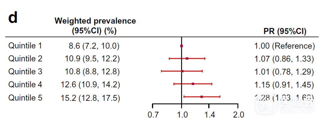人造光暴露水平每增加一个五分位数,与糖尿病患病率增加相关:PR=1.07(95%CI 1.02-1.12)。
