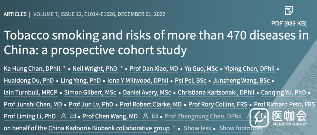 2022年12月1日,Lancet子刊《Lancet Public Health》(IF=72.427)刊登了一项来自中国慢性病前瞻性研究(CKB)的最新成果,探讨了中国人群中吸烟所致的疾病负担。结果显示,在中国成年人中,吸烟与多种疾病的发病和死亡风险相关,在男性中,由吸烟引起的疾病负担未来将进一步增加。