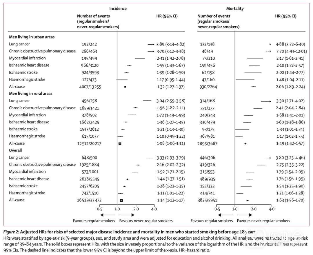开始吸烟时年龄较小的人,主要疾病的发病和死亡风险更高,特别是在城市地区(下图)。居住在城市地区的男性中,18岁以前开始吸烟,总死亡率的HR为2.06(95%CI 1.89-2.24),任一疾病发病率的HR为1.32(1.27-1.37);在15岁以前就开始吸烟,总死亡率的HR达到2.35(2.07-2.67),任一疾病发病率达到1.40(1.30-1.50)。