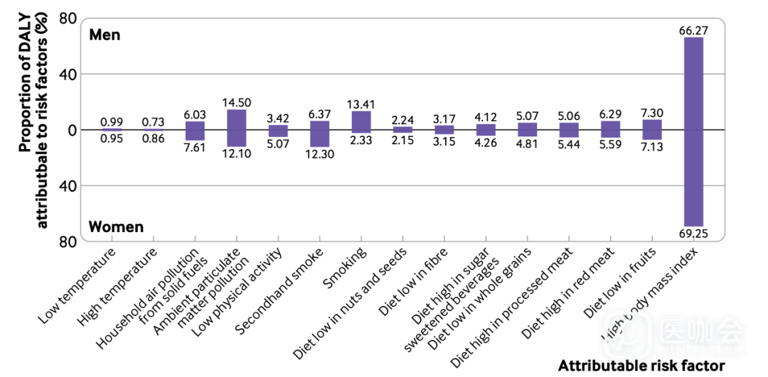 全球范围来讲,早发2型糖尿病的DALY可归因于三大类15个危险因素:行为因素(水果、坚果和种子类食物,全谷物和纤维摄入量低;红肉、加工肉和甜味饮料摄入量高;身体活动少;吸烟;二手烟);环境因素(低温、高温、家庭固体燃料空气污染、大气颗粒物污染);代谢因素(高BMI)。总体来讲,高BMI是最主要的危险因素。