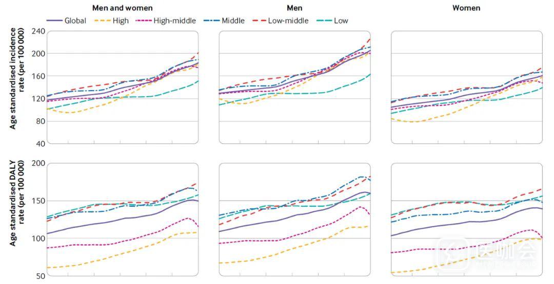 全球范围内,男性的年龄标化发病率和DALY率高于女性,男性和女性的年龄标化死亡率相似。