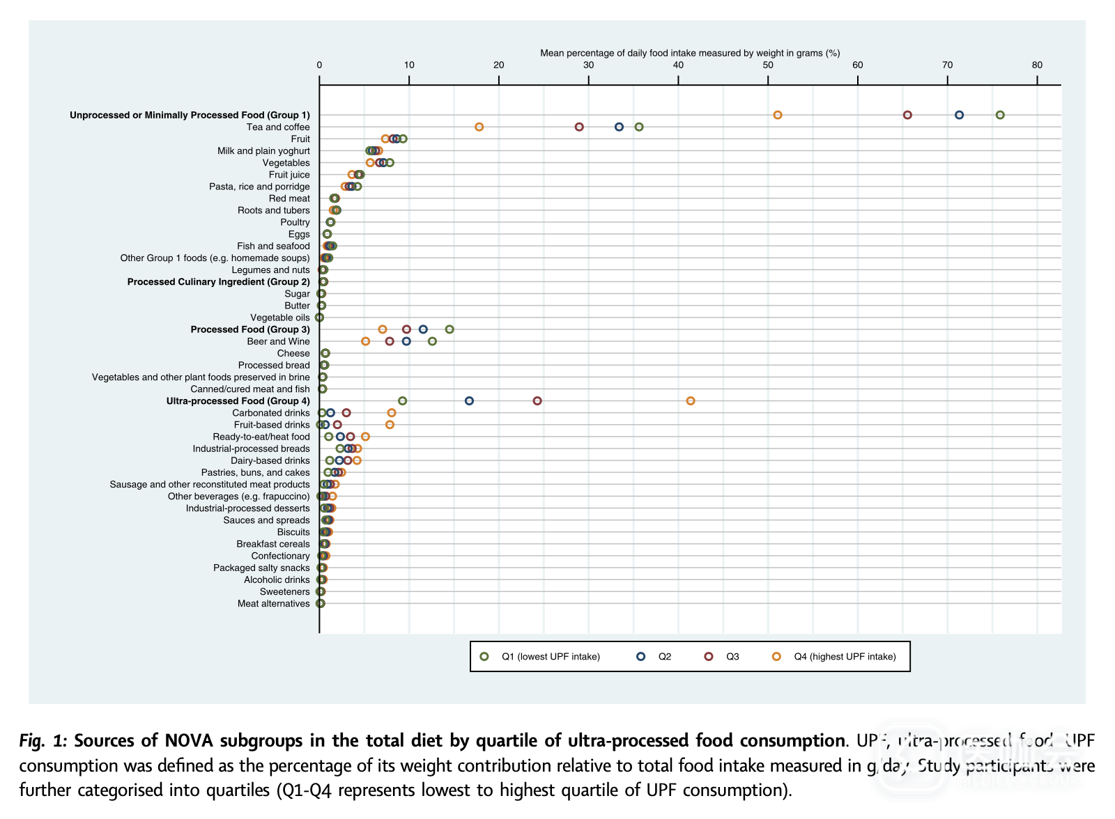 • 与UPF摄入量最低的四分位组相比,UPF摄入量最高的参与者更年轻。