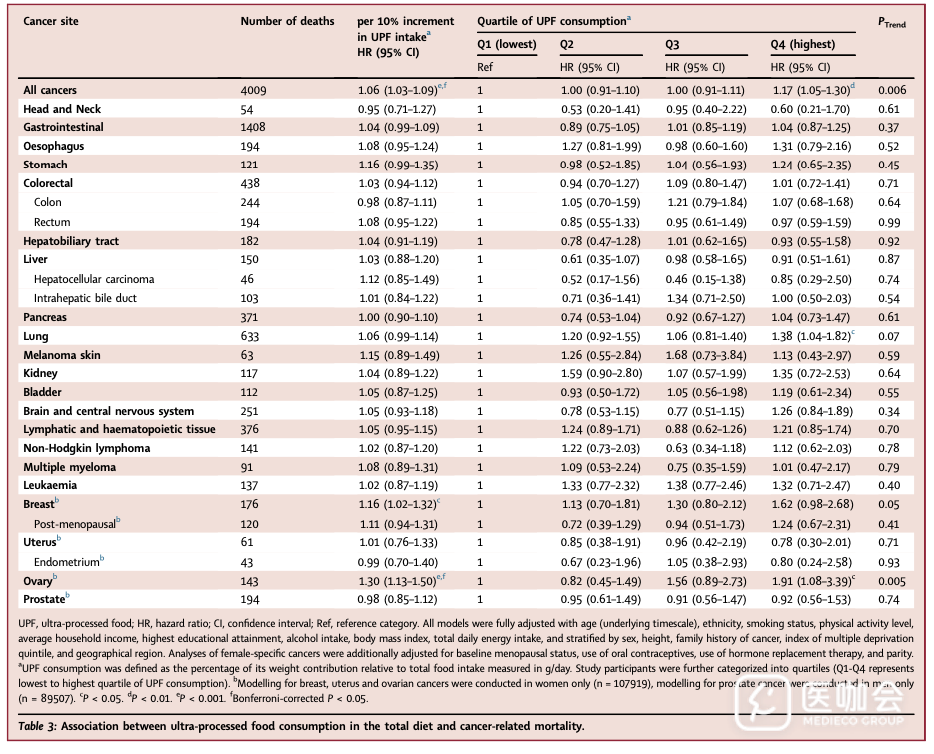 与UPF摄入量位于最低四分位组的参与者相比,UPF摄入量最高的参与者,总体癌症(HR=1.17,95%CI 1.05-1.30)、肺癌(HR=1.38,95%CI 1.04-3.82)和卵巢癌(HR=1.91,95%CI 1.08-3.39)的死亡风险明显更高。