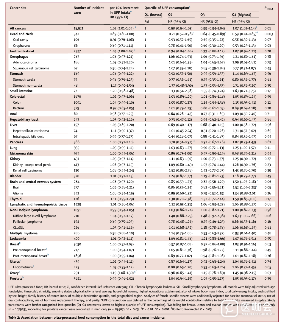 与UPF摄入量位于最低四分位组的参与者相比,UPF摄入量最高的参与者,总体癌症的发生风险增加7%(95%CI 1.02-1.14),肺癌风险增加25%(95%CI 1.01-1.57),脑癌风险增加52%(95%CI 1.04-2.23),弥漫性大B细胞淋巴瘤风险增加63%(95%CI 1.00-2.66)。