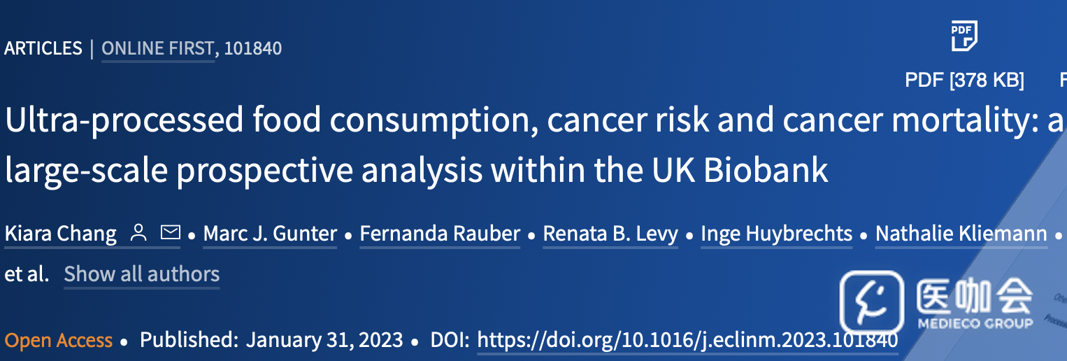 2023年1月31日,Lancet子刊《eClinicalMedicine》(IF=17.033)在线发表了一项研究,这项研究利用英国生物银行(UK Biobank)的数据,探讨了超加工食品(UPF)摄入量与癌症发病风险和死亡率之间的相关性。结果表明,UPF摄入量较高,可能与总体癌症和某些癌症(尤其是卵巢癌)的发病率和死亡率增加有关。