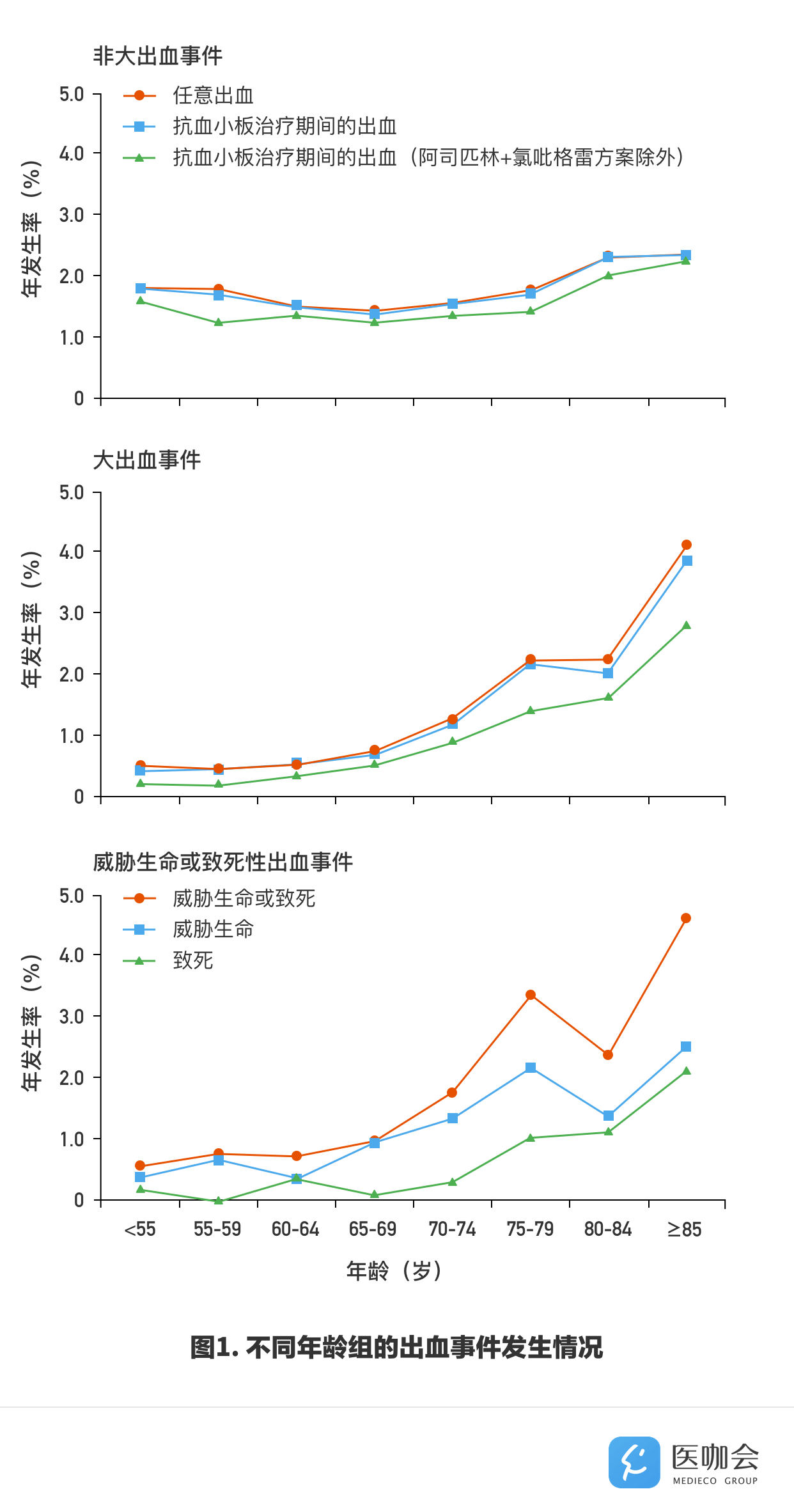 非大出血的风险和患者年龄无关,然而大出血的风险随着患者年龄增大迅速上升(≥75岁:风险比[HR] 3.10,95%CI 2.27-4.24;P<0.0001),尤其是致死性出血(5.53,2.65-11.54;P<0.0001),且在长期随访期间高风险一直持续。