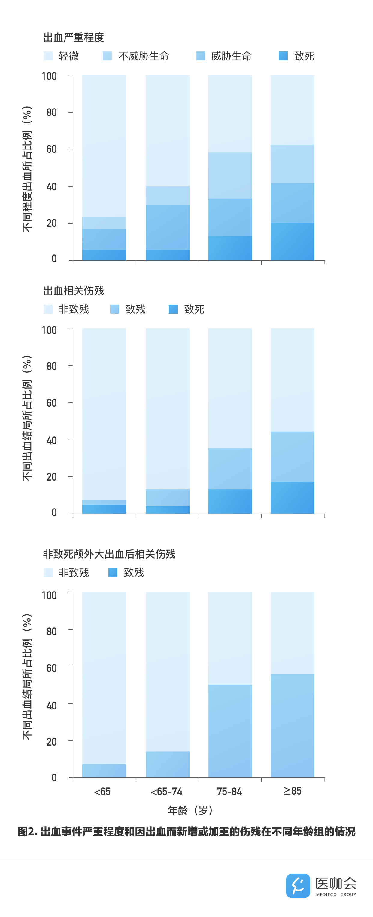 ≥75岁患者中,上消化道大出血多数为致残或致死性的(45/73,62%),这一比例高于复发性缺血性卒中导致的致残或致死性损伤(101/213,45%)。≥75岁患者中,致残或致死性上消化道大出血的数量要多于致残或致死性颅内出血(45 vs 18)。