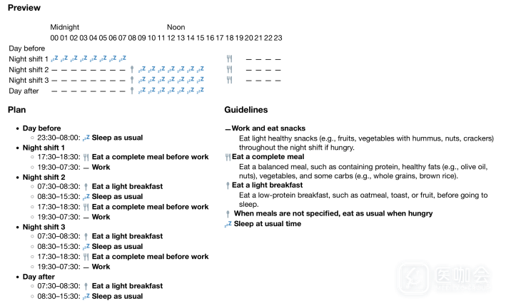 参与者会收到关于正餐和零食时间和内容的建议,如夜班前吃一顿完整的正餐,工作时吃健康零食(见图2)。基于时间营养学的建议已被证明可以提高警觉性、代谢功能和睡眠。