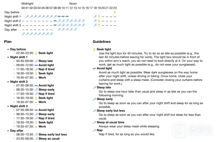 夜班前40分钟光照+上午避光+安排睡眠时间的措施可能是一种有效的方法,可以减少轮班护士的疲劳和工作有关错误。快速轮班的工作者或许可以尝试以晚间光照为基础的干预措施。
