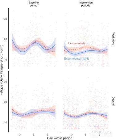 两组干预措施均显示可以减轻工作日期间的疲劳,但晚间光照干预组的疲劳减轻幅度更大(图3)。这一结果在研究后的问卷调查中也得到了体现,晚间光照干预组有更多的参与者表示工作时的疲劳或警觉性得到改善(73% vs. 41%)。