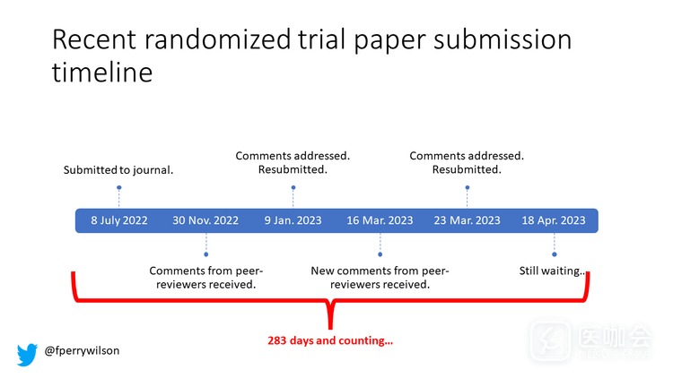 众所周知,同行评审周期通常都很漫长。举个真实的例子,作者在2022年7月8日将稿件提交给了一家期刊。文章被送去同行评审,作者在2022年11月30日即145天后收到了审稿人意见;2023年1月9日,将修改后的稿件再次交给了审稿人;2023年3月16日即66天后又收到新的评审意见,要求进一步修改;2023年3月23日作者回复了审稿人,并重新提交稿件;到4月20日,还没有新的消息。从最初提交到现在已经283天,大概九个多月(孩子都生出来了……)。