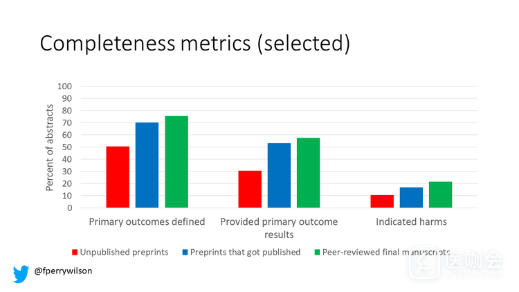 完整性的一个指标是,文章在摘要中是否提供了主要结局的结果?以上三类摘要分别有30%、53.4%和57.8%提供了主要结局。看起来初始的预印本文章与发表的最终版本的摘要很相似,但是有个问题,同行评审的文章,40%没有在摘要中报告主要成果?这感觉像是对同行评审的质疑,不像是对预印本平台的质疑。