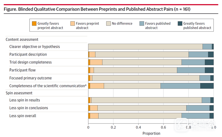 当将预印本摘要与其同行评审的摘要进行比较时,整体来看,同行评审的摘要更完整,总体上存在更少的“spin”。但是看到下图那些米灰色区域了吗?这些是配对的预印本和同行评审的摘要,没有差异的文章还是占多数。