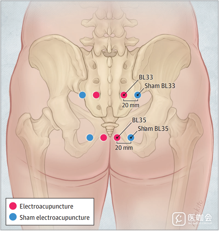 2017年6月27日,最新一期的JAMA杂志出炉。让人惊喜的是,本期看到了三篇来自中国的研究,其中两篇都是关于针灸的临床研究(另一篇为中国糖尿病患病率的研究,详见本日公众号推送的另外一篇文章)。接下来,我们一起来膜拜下这两篇文章。电针治疗压力性尿失禁该研究通讯作者为中国中医科学院首席研究员刘保延,第一作者为广安门医院主任医师刘志顺,国内12家医院参与完成。研究目的是为了评估电针治疗压力性尿失禁(SUI)女性患者的疗效[1]。研究在2013年10月至2015年5月共纳入504名SUI女性患者(平均年龄55.3岁),在2015年12月完成数据收集。患者被1:1随机分配至接受18次(持续6周)腰骶部区域的电针治疗(n=252),或接受假电针治疗(非穴位点浅刺)(n=252)。图1. 电针组和假电针组的穴位点主要结局为治疗6周后相比基线的漏尿量变化,通过1小时尿垫试验来进行测量。次要结局为72小时平均尿失禁次数,通过72小时排尿日记来测量。基线时,电针组和假电针组患者的平均漏尿量分别为18.4g和19.1g;72小时平均尿失禁次数分别为7.9和7.7次。6周时,电针组的平均漏尿量的减少要高于假电针组(-9.9g vs -2.6g;P<0.001)。电针组相比基线时的72小时平均尿失禁次数变化要高于假电针组:1周到6周,组间差异为1次(95%CI 0.2-1.7;P=0.01);15周到18周,组间差异为2次(95%CI 1.3-2.7;P<0.001);27周到30周,组间差异为2.1次(95%CI 1.3-2.8;P<0.001)。研究得出结论,对于压力性尿失禁女性,与假电针治疗相比