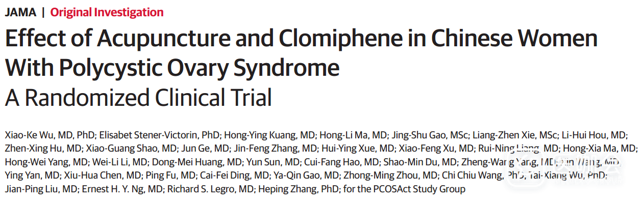 研究的通讯作者和第一作者为黑龙江中医药大学附属第一医院的吴效科教授,国内27家医院参与完成。研究目的是评估针刺治疗单独或者联合克罗米芬对多囊卵巢综合征女性活产率的影响[2]。