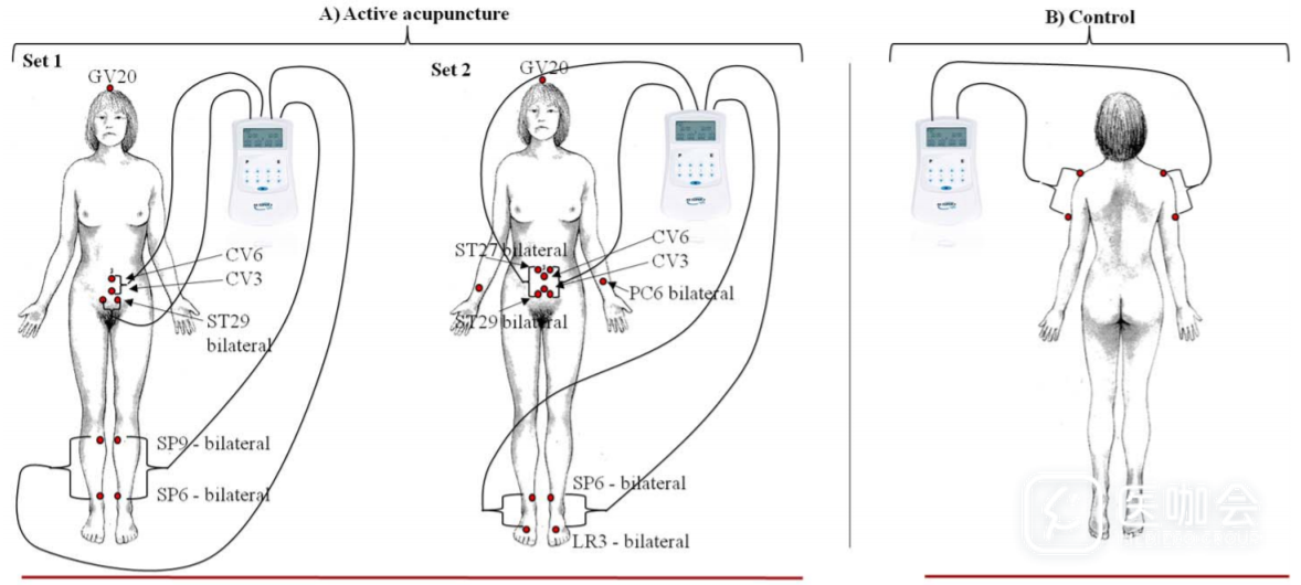 试验从2012年7月6日到2014年11月18日进行,并进行10个月的孕期随访,直到2015年的10月7日。1000名中国多囊卵巢综合征女性患者被1:1:1:1随机分配到4组:①针刺(active acupuncture)+克罗米芬;②假针刺(control acupuncture)+克罗米芬;③针刺+安慰剂;④假针刺+安慰剂。针刺组为深刺,并联合手法刺激和低频电针刺;假针刺组为非穴位点的浅刺,无手法刺激,无电流(图2)。针刺治疗为一周两次,每次30分钟;克罗米芬或安慰剂治疗为每个周期5天,共4个周期。