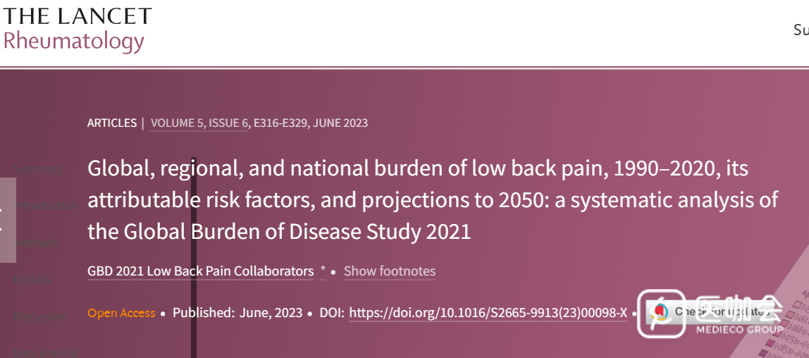 近期,柳叶刀子刊《Lancet Rheumatology》(IF= 35.48)发表了全球疾病负担研究(GBD 2021)的一篇分析文章,估计了1990-2020年全球和不同地区的腰痛疾病负担和风险因素。2020年,全球估计有6.19亿人患有腰痛,预计到2050年,该数字将达到8.43亿。