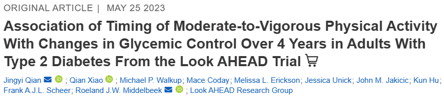 2023年5月25日,《Diabetes Care 》期刊发表了Look AHEAD研究的结果,显示 最常在下午运动的人,血糖控制最佳 。
