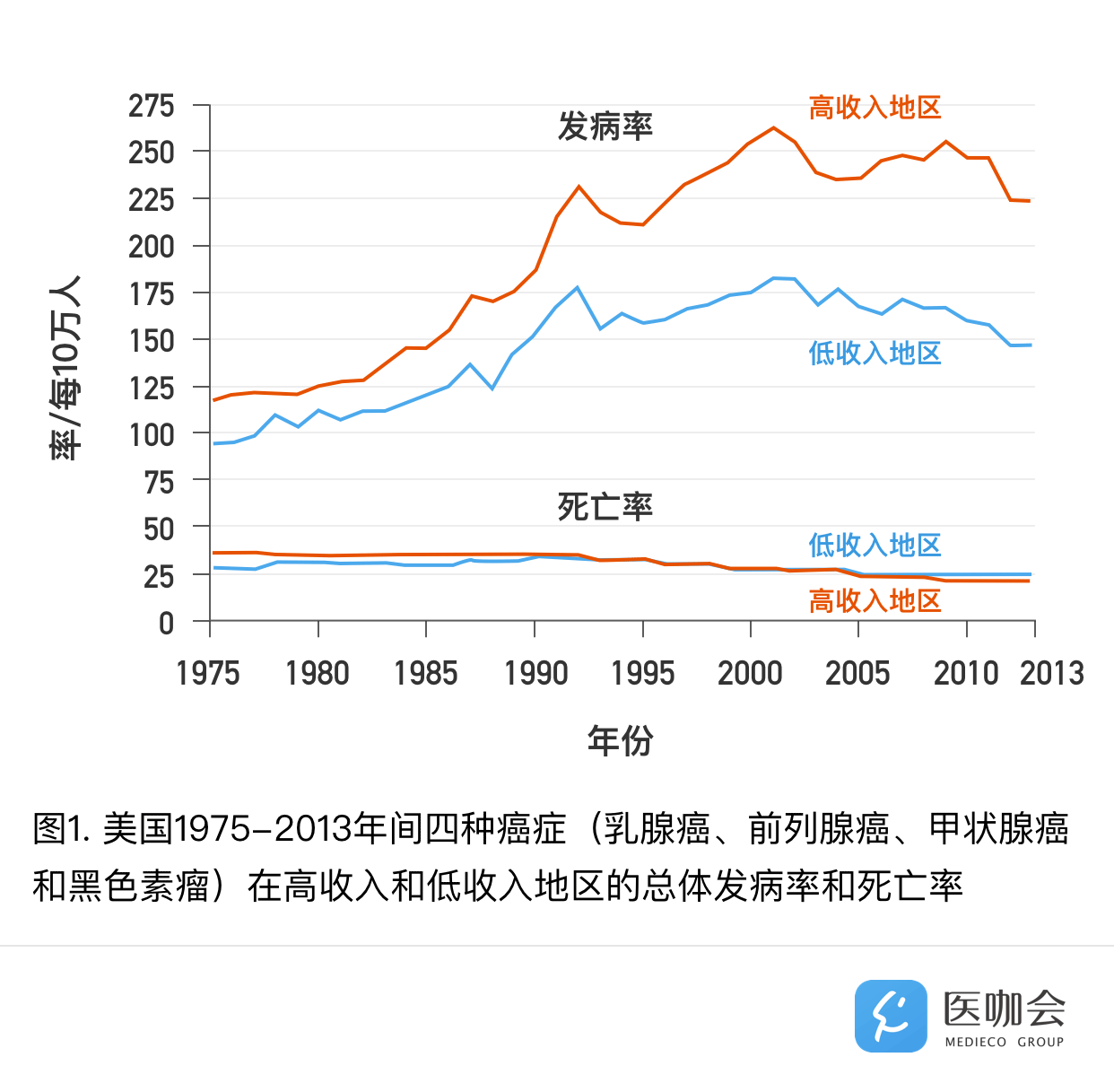 作者利用SEER(Surveillance, Epidemiology, and End Results program)数据库,按照地区的收入水平(高收入:家庭收入>$75,000 vs. 低收入:家庭收入<$40,000)分组,绘制了美国在1975-2013年4种常见癌症—女性乳腺癌、前列腺癌、甲状腺癌和黑色素瘤,在白人中的总体发病率和死亡率趋势[4]。