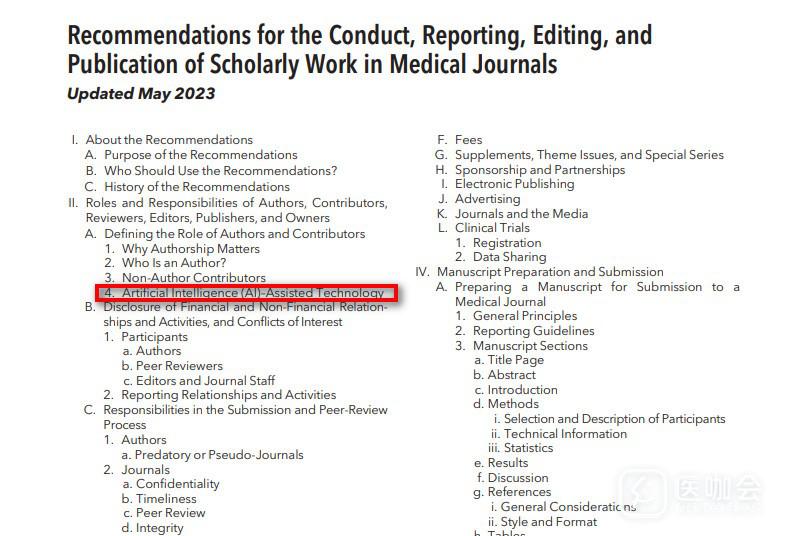 ICMJE 在2023年5月更新的建议,大部分变化涉及AI在学术出版和编辑过程中的使用,突出了人工智能相关的问题。在“定义作者和贡献者角色”的部分,添加了一个新章节“Artificial Intelligence (AI)-Assisted Technology”。在这个部分中,ICMJE的声明如下: