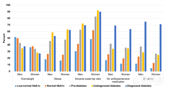 同样,与男性相比,正常HbA1c组的女性使用两种药物的比例更低(降压药:女性19.6% vs. 男性25.9%; 他汀类药物:12.8% vs. 22.4%)。