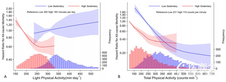 在低静坐和高静坐参与者中,总体力活动与死亡风险呈曲线负相关。低静坐和高静坐的参与者中,总体力活动分别为每分钟690次和450次的参与者死亡风险最低: