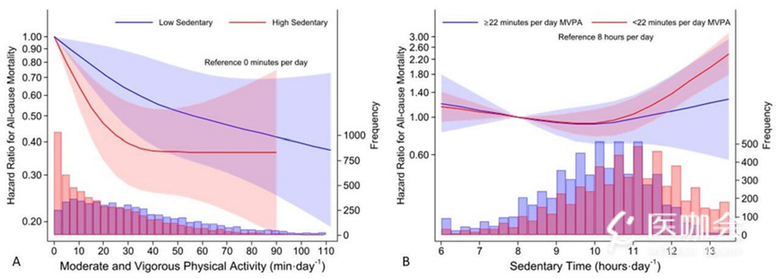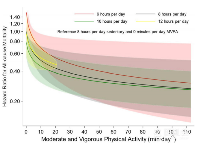 静坐时间仅在每天MVPA<22分钟的个体中与较高的死亡风险相关。不论静坐时间多久,MVPA均与较低的死亡风险相关。促进体力活动可能对个人有实质性的健康益处,轻度MVPA可能改善久坐所致的死亡风险增加。