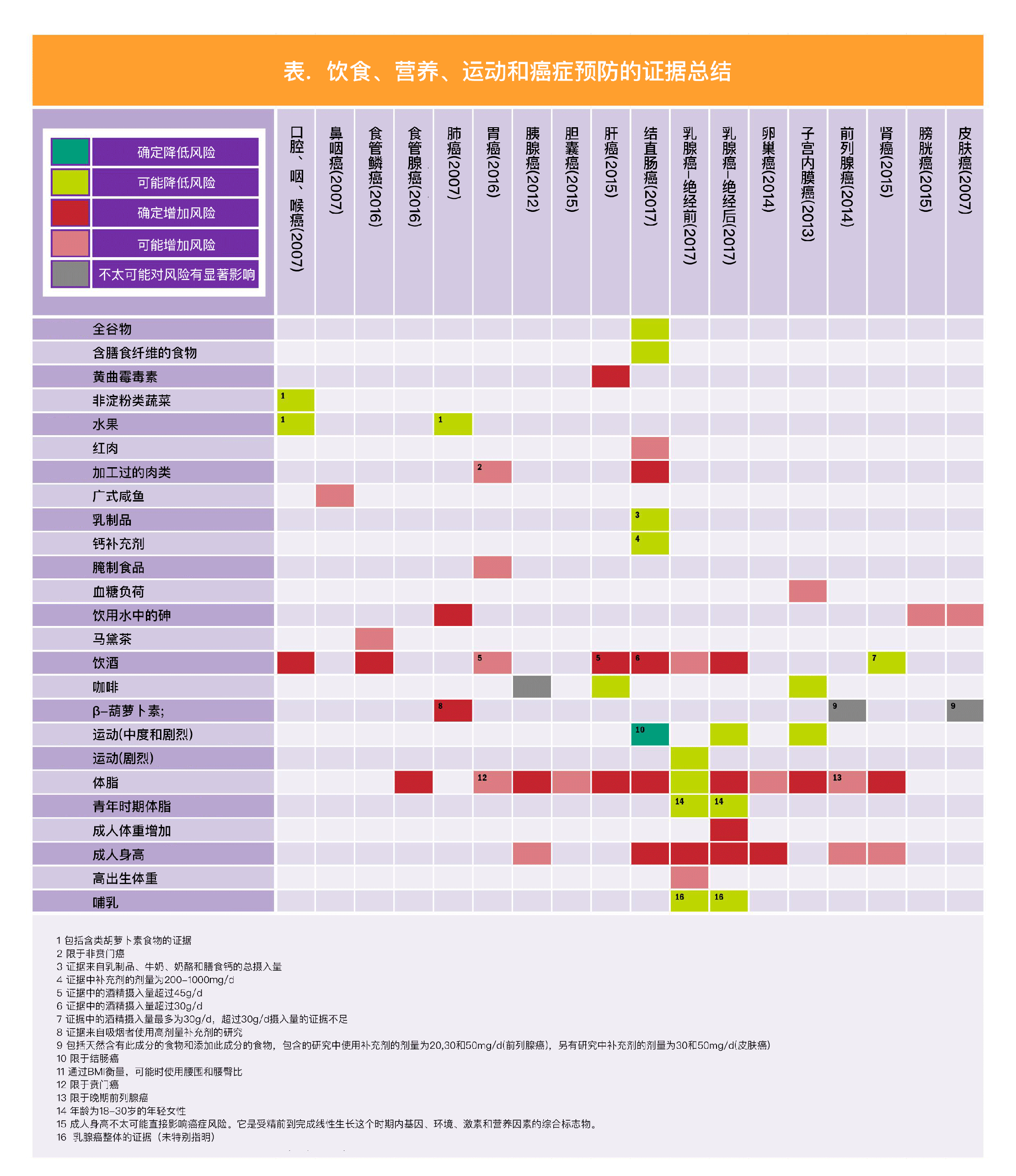 2017年5月份,WCRF/美国癌症研究学会(AICR)就“饮食、营养、运动和乳腺癌”发布报告;2017年9月份,WCRF/AICR发布最新报告——“饮食、营养、运动和结直肠癌”。其他肿瘤的最新版报告,则是在2016年或之前发布。WCRF同时更新了一份总结,详见下表[1]。