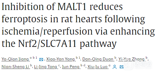 然而,在被《Cardiovascular Drugs and Therapy》拒稿几个月后,该文章又发表到了Elsevier旗下期刊《European Journal of Pharmacology》上,标题为“Inhibition of MALT1 reduces ferroptosis in rat hearts following ischemia/reperfusion via enhancing the Nrf2/SLC7A11 pathway [抑制MALT1可通过增强Nrf2/SLC7A11通路减少缺血/再灌注后大鼠心脏铁死亡]”。