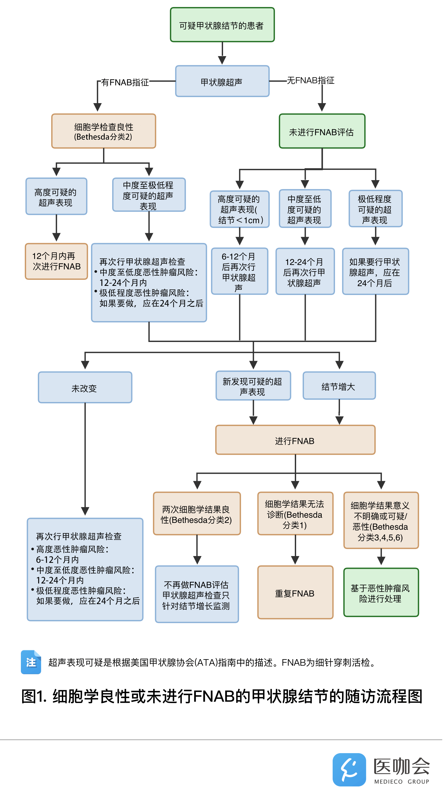 基于超声表现预测的恶性肿瘤风险,不仅指导细针穿刺活检(FNAB)的初始指征,还指导随访,详见图1。