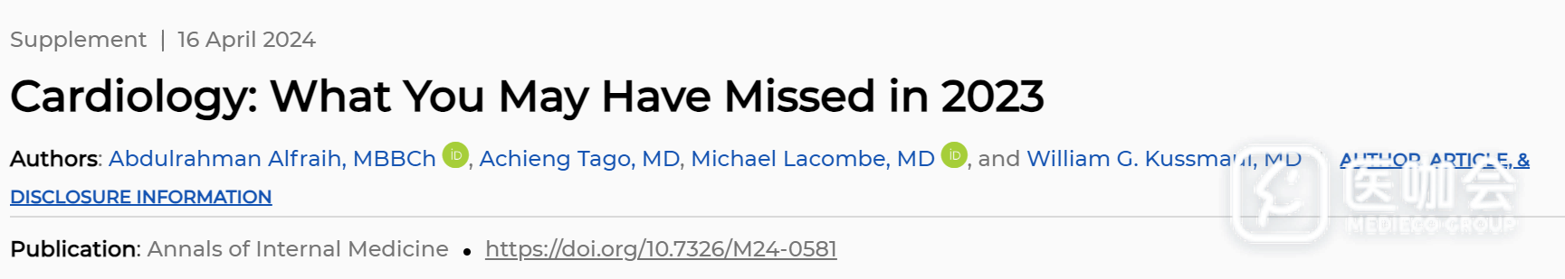 2024年4月16日,《内科学年鉴》(IF=39.2)发表了一期“2023年你可能错过的研究”增刊。小咖对其中重点介绍心血管领域研究的文章进行了梳理,前面两篇推文介绍了其中一些研究(相关阅读:《内科学年鉴》推荐:你可能错过的2023年心血管研究;《内科学年鉴》:2023年不可错过的心血管研究(二);《内科学年鉴》:2023年不可错过的心血管研究(三))。这篇文章,我们继续带大家总结2023年重要的心血管研究。