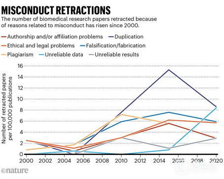 Ruano‐Ravina等专门研究了因学术不端而撤稿的论文,发现学术不端的主要类型随时间的推移发生了变化。2000年,撤稿比例最高的是伦理和法律问题、作者身份问题(包括可疑或虚假的作者身份、缺乏作者批准等)、以及图片、数据或文本的重复使用。到2020年,内容的重复使用是撤稿的主要原因,也有相当比例的论文因“数据不可靠”而撤稿。